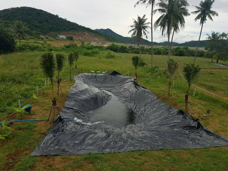 ทาง คุณมันตา ได้ใช้วิธีการเลือกผืนพลาสติก LDPE ความหนา 0.3 มิลลิเมตร (300 ไมครอน) เป็นผืนสี่เหลี่ยมเต็ม โดยมีขนาดผืน 12 x 30 เมตร ไปปูบ่อ