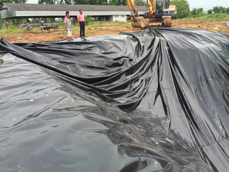 พลาสติก LDPE จากเกษตรพลัส ปูรองใต้บ่อขยะสด เพื่อป้องกันของเสีย ที่เกิดจากขยะลงสู่พื้นดิน ไม่เป็นมลพิษต่อธรรมชาติ ซึ่งเป็นบ่อขยะภายในชุมชน