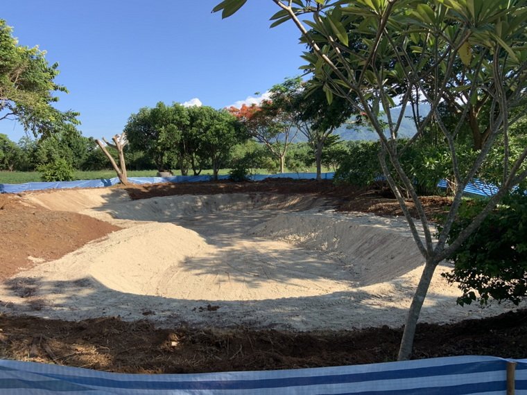 ขั้นตอนก่อนการปูบ่อ ทาง Mr.Marcel ได้ทำการปรับบ่อให้เรียบร้อย และปรับผิวดินด้วยทราย เพื่อให้ตัวบ่อพร้อมที่จะปูพลาสติกมากที่สุด
