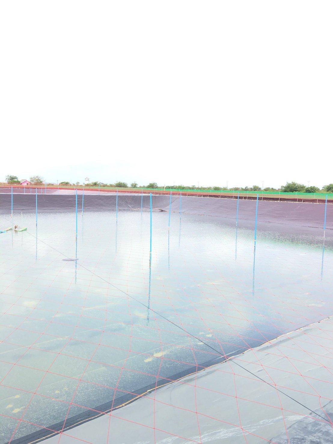 ปูบ่อพลาสติก LDPE แบบฝังชาย โดยใช้สลิงพลาสติก PE สำหรับการใช้งานเพาะเลี้ยงสัตว์น้ำ ตัวพลาสติกจะถูกแยกเป็นผืน ๆ ไปปู และกดยึดด้วยสลิงพลาสติก PE
