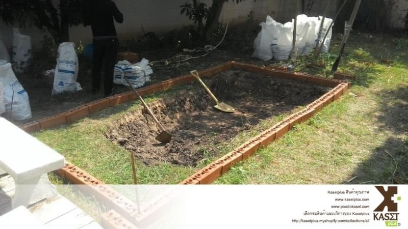 เมื่อขุดดินลงไปแล้วก็ทำการปรับพื้นที่ด้านล่างด้วยการรองทราย และโฟม และกระเบื้อง