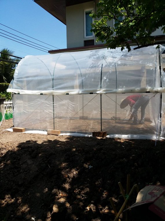 ตัวพลาสติกคลุมโรงเรือน เปลี่ยนให้เป็นพลาสติก LLDPE ใสขุ่น ความหนา 0.2 มิลลิเมตร (200 ไมครอน) และติดตั้งมุ้งตาข่ายกันแมลง ความถี่ตา 40