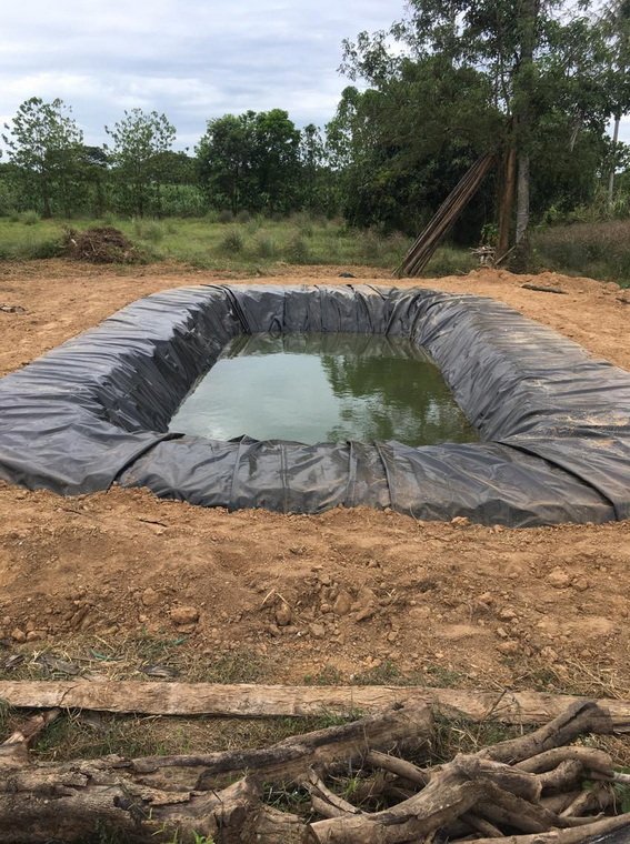 สำหรับบ่อนี้ถูกปูด้วยผืนพลาสติก LDPE ความหนา 0.3 มิลลิเมตร (300 ไมครอน) ขนาดผืน 10x14 เมตร