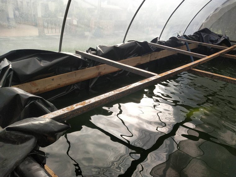 ปูบ่อเก็บน้ำกลางแสงที่โล่งแจ้งแล้ว ก็ใช้งานในใต้หลังคาอีก ใช้ตัวผืนพลาสติก LDPE มาปูใส่โครงสร้างไม้ เพื่อเลี้ยงปลา ใต้หลังคาโรงเรือน