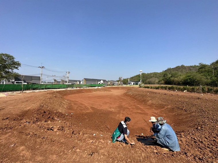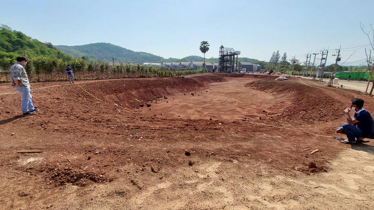 ทีมงาน เกษตรพลัส เข้าสู่พื้นที่หน้างาน และทำการวัดพื้นที่ เพื่อให้ประหยัดค่าใช้จ่ายเรื่องพลาสติก LDPE เพราะตัวบ่อเอง เป็นฟรีฟอร์ม มีส่วนที่หด และโค้งไปโค้งมา ที่ไม่ได้จำเป็นต้องปูพลาสติกไปถึง