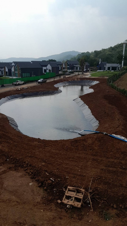 พลาสติก LDPE ปูสระน้ำ สำหรับจัดสวนในพื้นที่หมู่บ้านจัดสรร อำเภอเขาใหญ่ จังหวัดนครราชสีมา เพื่อใช้งานสำหรับการตกแต่งพื้นที่ แลเพื่อใช้งานน้ำดูแลต้นไม้ภายในพื้นที่หมู่บ้าน